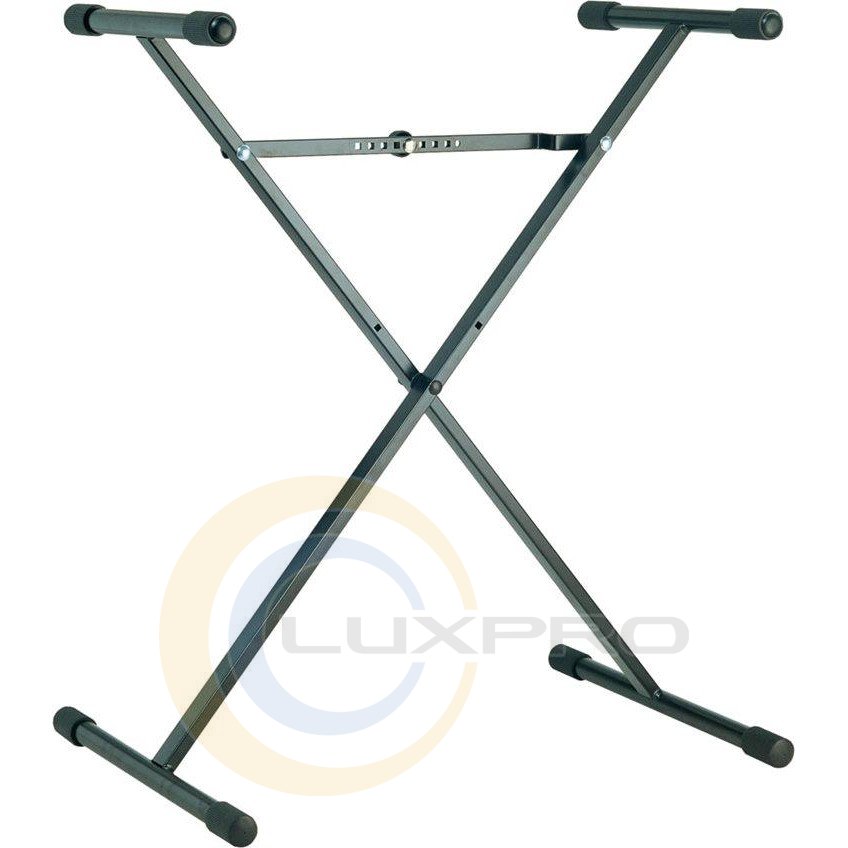 Х-образная стойка с возможностью фиксации на особо малой высоте. Легко устанавливается и складывается. Уникальный механизм регулировки гарантирует, что стойка всегда фиксируется на нужной высоте и ширине. Трубчатая конструкция с защитными накладками, не оставляющими следов на инструменте. Ножки на регулируемых торцевых заглушках для придания устойчивости на неровных поверхностях.