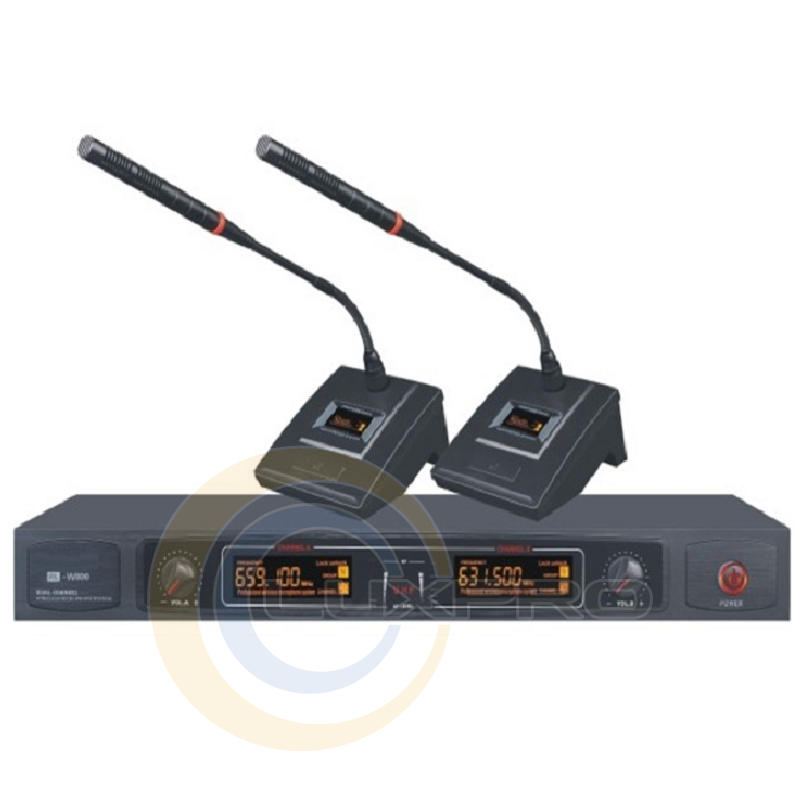 Беспроводная конференционная 2-x канальная VHF микрофонная система RL-W800. Управление шумоподавление: Noise-Lock, диапазон воспроизводимых частот: 80Гц-15кГц, рабочий диапазон: 50 м в открытой местности, мощность передатчика: <10mW, тип выхода: отдельные или смешанный выход.