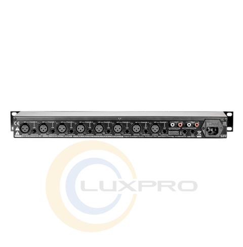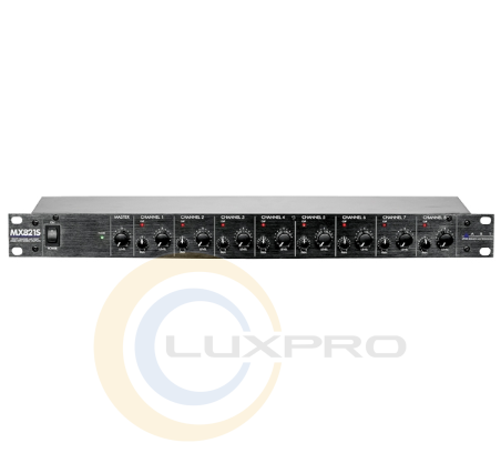 Рэковый микшер со стерео выходом, 8 каналов mic (XLR)/line(TRS1/4") с регулировкой уровня сигнала и панорамы, фантом +48V на каждом входе, балансный TRS Jack выход с регулировкой уровня сигнала, Prefade Out и Aux Bus на RCA, 1U.