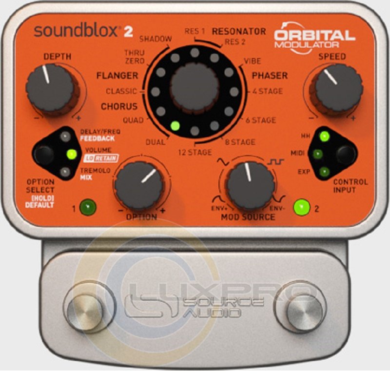 SOURCE AUDIO Soundblox 2 Orbital Modulator представляет собой супер-компактную, прочную и очень гибкую в настройках педаль мульти-эффектов с большой коллекцией разнообразных phaser, flanger, chorus и tremolo эффектов. Двенадцать типов эффектов, девять регулируемых параметров, плюс внутреннее или внешнее управление модуляцией, делают этого микро-монстра уходящим далеко за пределы звукового ограничения традиционных педалей модуляции.Soundblox 2 Orbital Modulator обеспечивает бесконечные возможности модуляции, включая различные варианты хоруса, флэнжера, тремоло и фэйзера. Эти эффекты регулируются 9 параметрами: DEPTH, FEEDBACK, DELAY, FREQUENCY, VOLUME, LoRETAIN, TREMOLO, MIX и SPEED. Управление модуляцией внутренне или внешне. Переключать выбранные настройки и сохранять их можно с помощью двух переключателей. Устройство поставляется с 9В блоком питания.Характеристики: