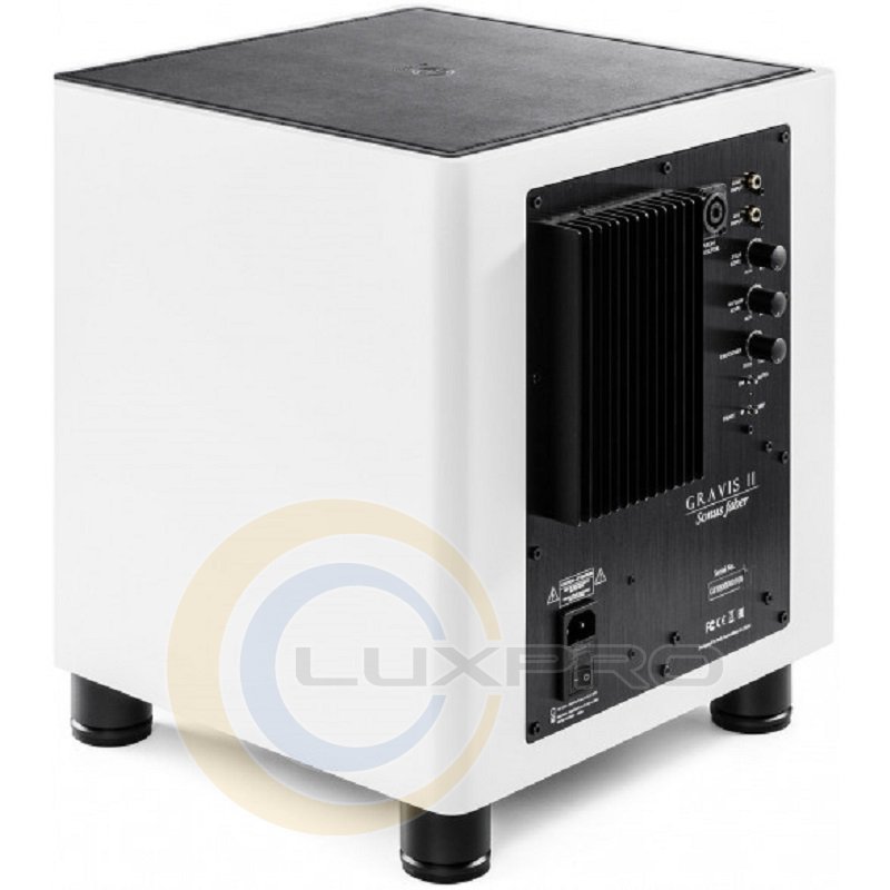 Мощность встроенного усилителя Sonus Faber Gravis II составляет 350 Вт и работает в классе A/B, благодаря чему сабвуфер обладает настоящим Hi-Fi-звуком. Набор разъемов и органов управления у данной модели такой же, как и у остальных сабвуферов серии. Входной сигнал на Sonus Faber Gravis Il может быть подан через низкоуровневые (линейный или LFE) или акустический входы. Сабвуферы Gravis I и Gravis II имеют такие же варианты отделки, как и у колонок Sonetto: матовый белый, черный рояльный лак и шпон орехового дерева.