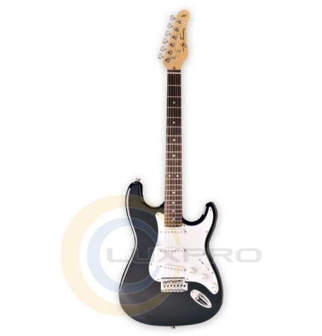 Электрогитара типа Strat, цельный корпус, гриф - клен с палисандровой накладкой, 3 датчика типа сингл, 5-позиционный переключатель, тремоло, белый пикгард, цвет черный.