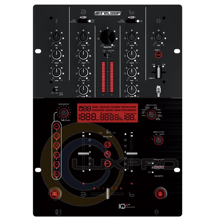 RELOOP IQ.2 USB – Dj микшер, обладает эффектами, свойственным пультам высокой ценовой категории(Echo, Auto Pan, Flanger, Manual Filter, Auto Filter, Reverb, Trans, Pitch Shifter) А так же новыми инновационными и интуитивными crossfader эффектами(Filter X, Delay X, Pitch X) IQ2+ первый шаг в новую эру микшеров.