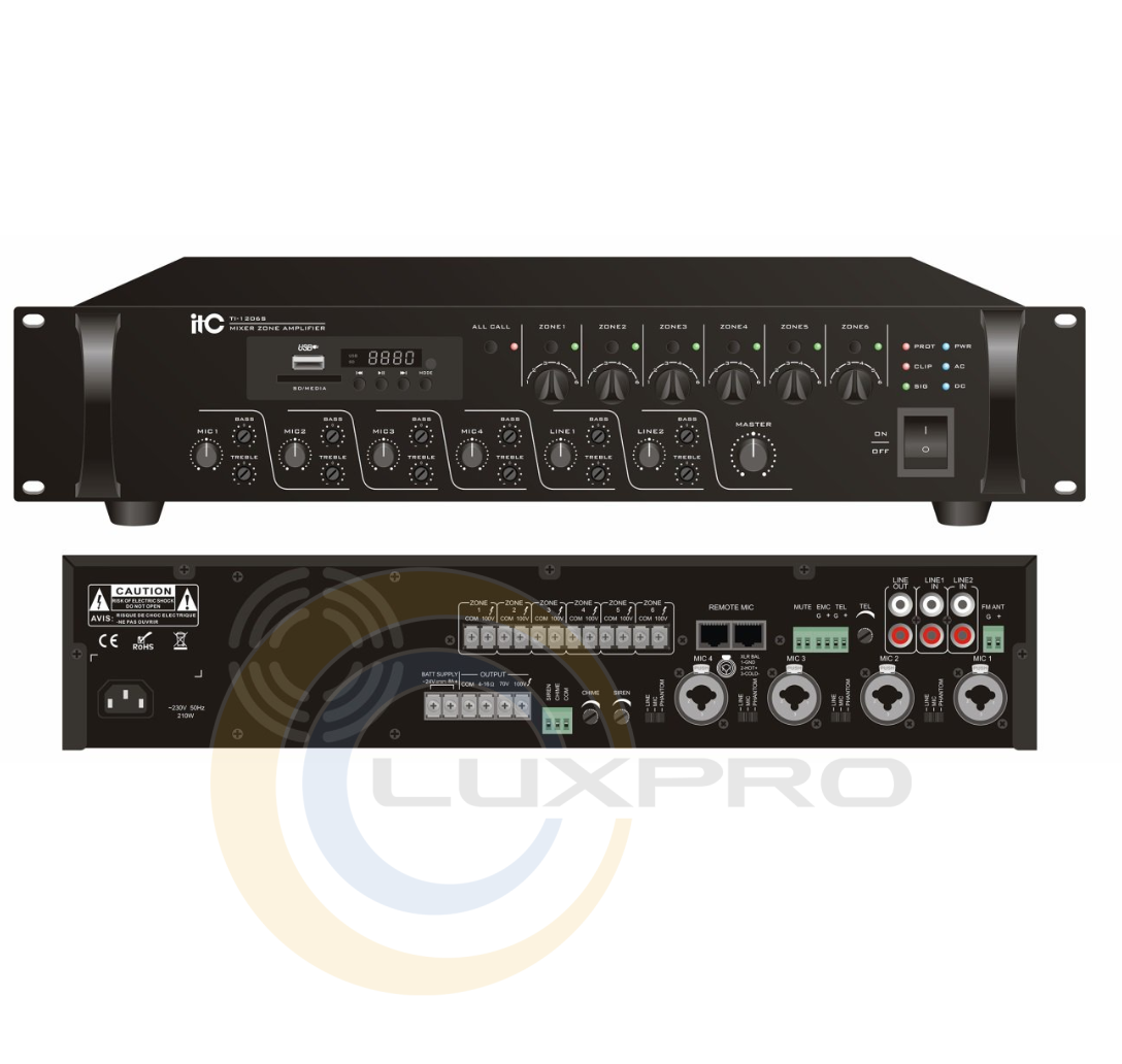 Усилитель ITC TI-2406S, предназначен для подключения источников звука и построения систем озвучивания для 6 зон. Усилитель имеет USB-вход, FM-тюнер, Bluetooth, 4 микрофонных входа, 2 линейных, защиту от короткого замыкания, перегрузок и высоких температур, 5 уровней приоритета.Характеристики:
