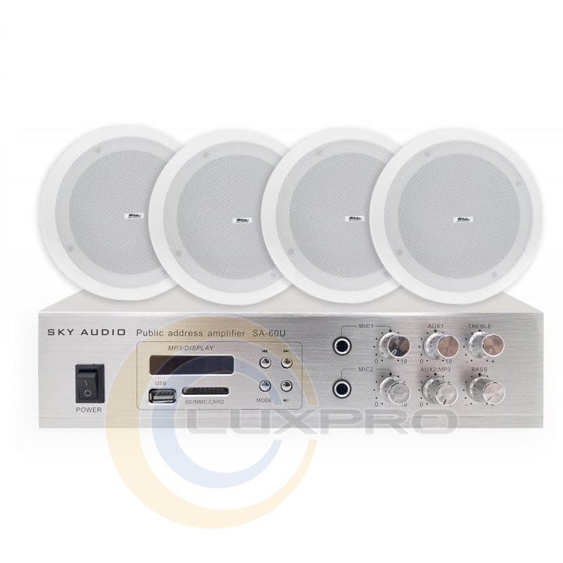 Акустический комплект Sky Sound CS-7014 состоит из 4-х потолочных динамиков Sky Sound CSL-701 и одного усилителя мощности Sky Sound SA-60U.