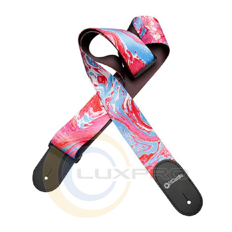 DIMARZIO DD3144 - ремень для гитары, с кожаными наконечниками, подписная модель Steve Vai, ширина 5см, длина до 160мм, шнурок для крепления на акустику в комплекте, цвет: Blue Cherry Universe. Ремень изготовлен из микрофибрового волокна с высококачественной печатью, а наконечники выполнены из натуральной стеганой кожи. Также в комплекте с ремнем идет специальный шнурок, для использования с акустической гитарой.