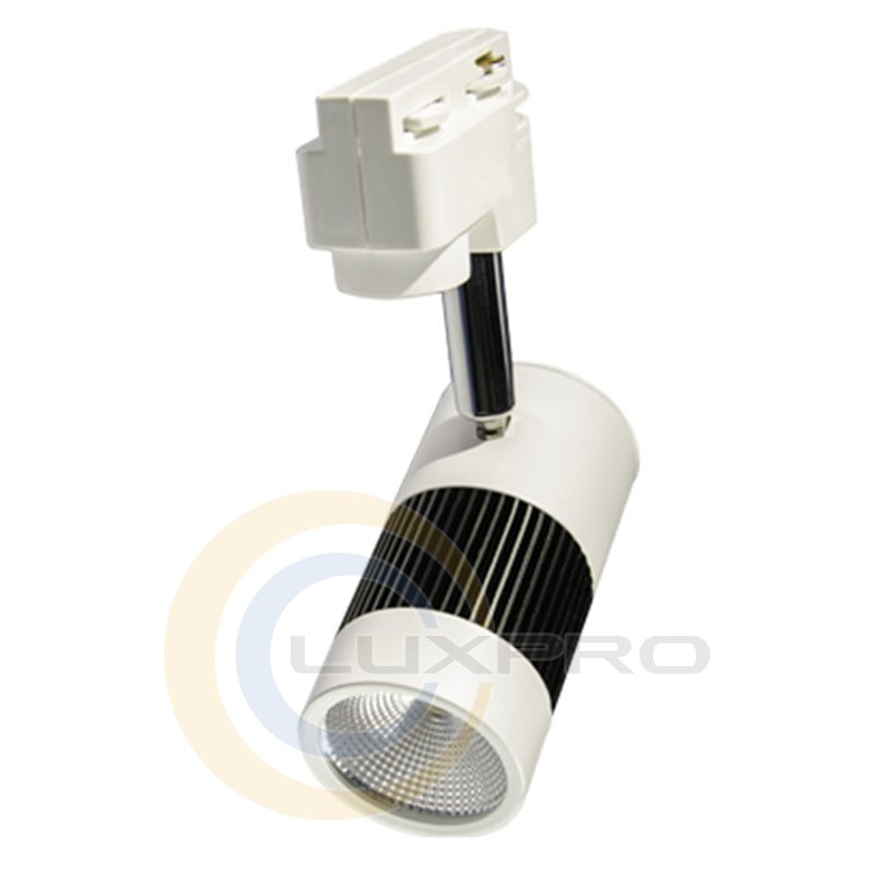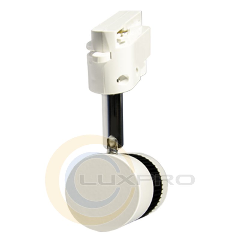 Круглый рефлектор, изготовленный из анодированного сплава алюминия. Однофазный шинопровод предназначен для напряжения 220 Вольт. При мощности 8 Вт такой прибор дает световой поток 1200 Лм. Нейтральный белый свет имеет цветовую температуру 4200 К и угол рассеивания от 12° до 40°.