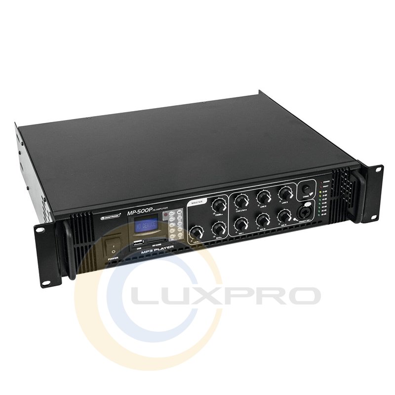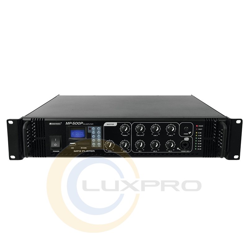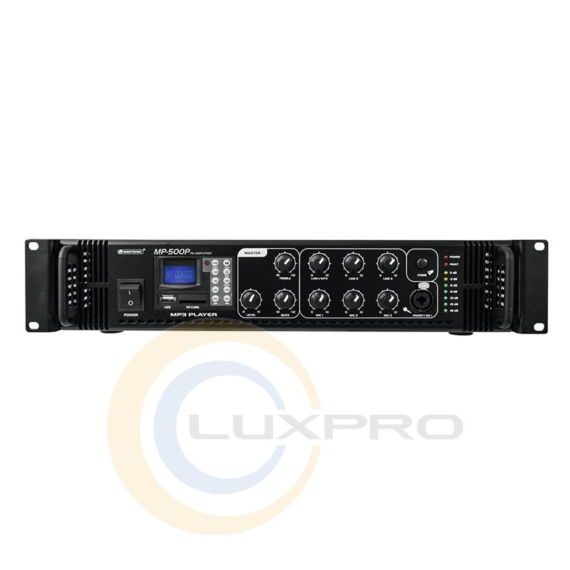Omnitronic MP500P - усилитель на 100 В с MP3-плеером с ИК-пультом и ЖК-дисплеем с синей подсветкой, слотом для карты SD и входом USB, 7-уровневым светодиодным дисплеем, верхним и нижним уровнями управления, главным выходом и схемой защиты со светодиодной индикацией: перегрузка по току, короткое замыкание, задержка включения.