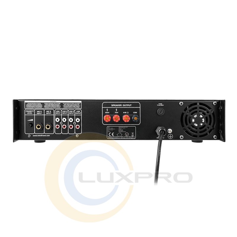 OMNITRONIC MP-500P имеет 3 микрофонных входа (6,3 мм, несбалансированный) с отдельными регуляторами уровня, 3 микрофонных входа с регулируемой цепью приоритета, 3 линейных входа (стерео RCA) с отдельными регуляторами уровня, выходы PA для колонки PA 70 В или 100 В или для колонок с низким импедансом (4-16 Ом) и 1 линейный выход (стерео RCA).