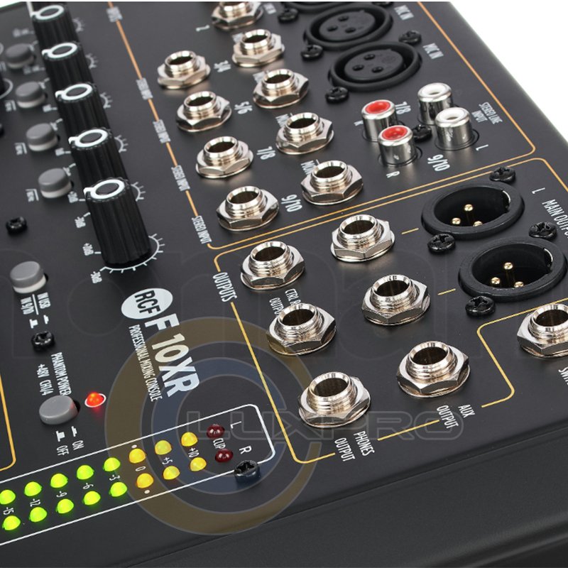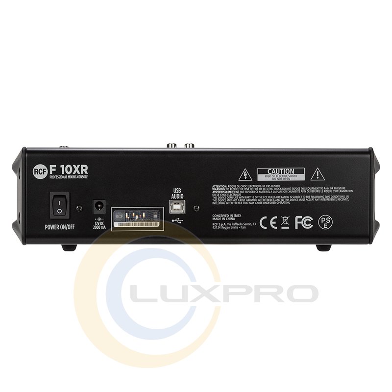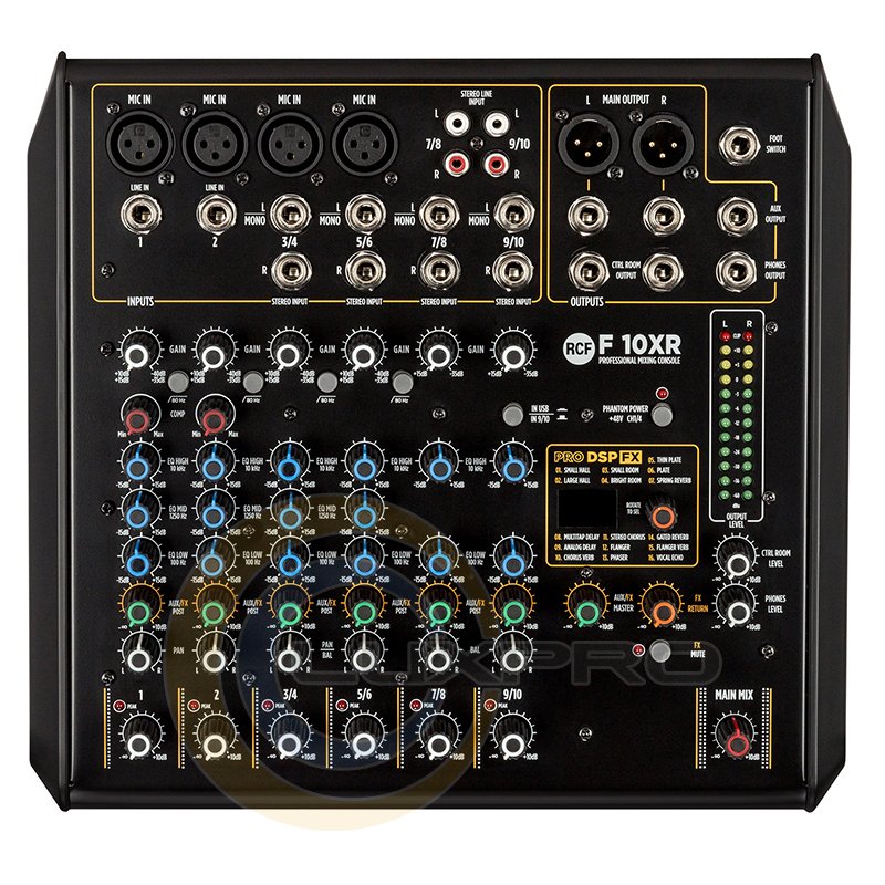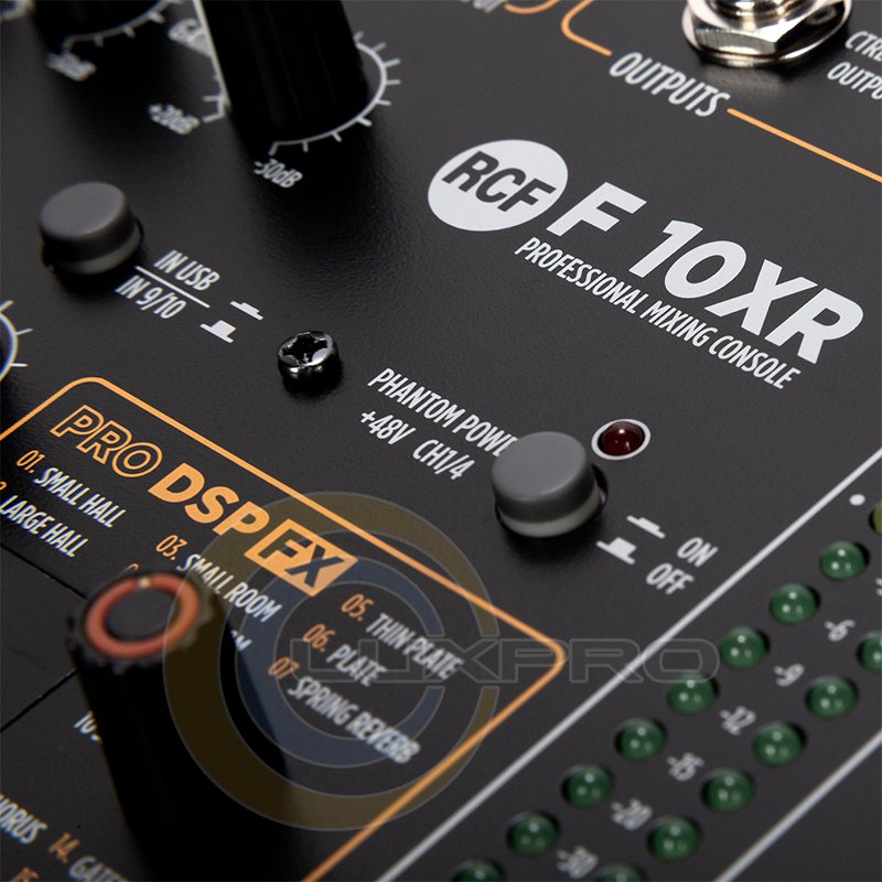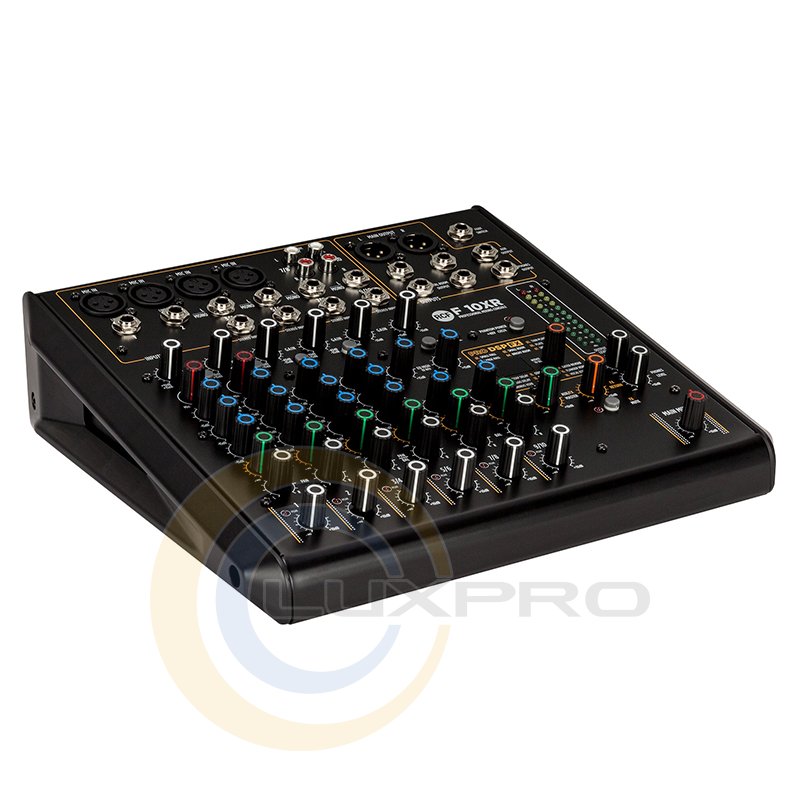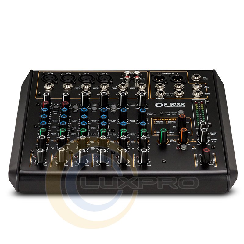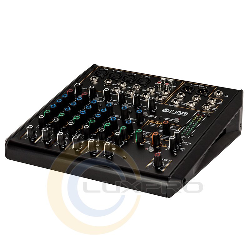 F 10XR имеет 4 микрофонных предусилителя, 2 монофонических линейных входа, 4 стереофонических линейных входа, мульти-FX и запись через порт USB, со сбалансированным главным выходом + 28 дБ (Stereo XLR + TRS) и 2 компрессорами с одинарным управлением. Моно каналы оснащены 3-полосным эквалайзером и стерео с 2-полосным. Микшер имеет 16 встроенных пресетов PRO DSP FX и функцию Aux send (пост-фейдер) с поворотным регулятором.