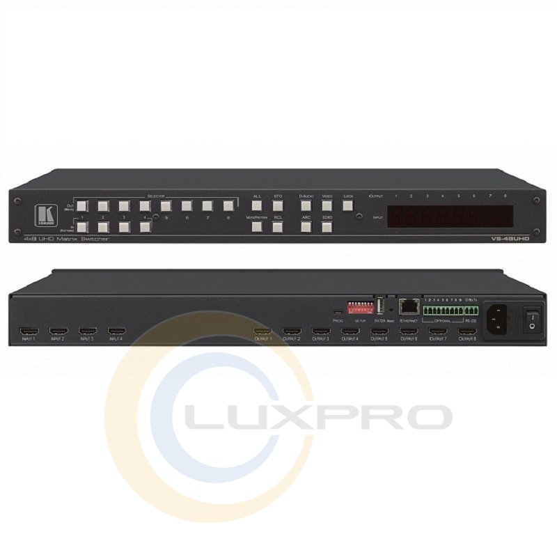 VS-48UHD – матричный коммутатор 4х8 сигналов HDMI разрешением до 4K@60Hz (4:2:0) и встроенных цифровых аудиосигналов. Прибор выполняет перетактирование входного сигнала и компенсацию АЧХ кабеля, после чего распределяет сигнал на один или несколько выходов одновременно, соответствуя требованиям HDCP. VS-48UHD обеспечивает независимую матричную коммутацию эмбедированных в сигнал HDMI цифровых аудиосигналов, включая аудиосигнал в обратных аудиоканалах (ARC). При этом совокупная размерность матрицы аудиосигналов составляет 12х10.