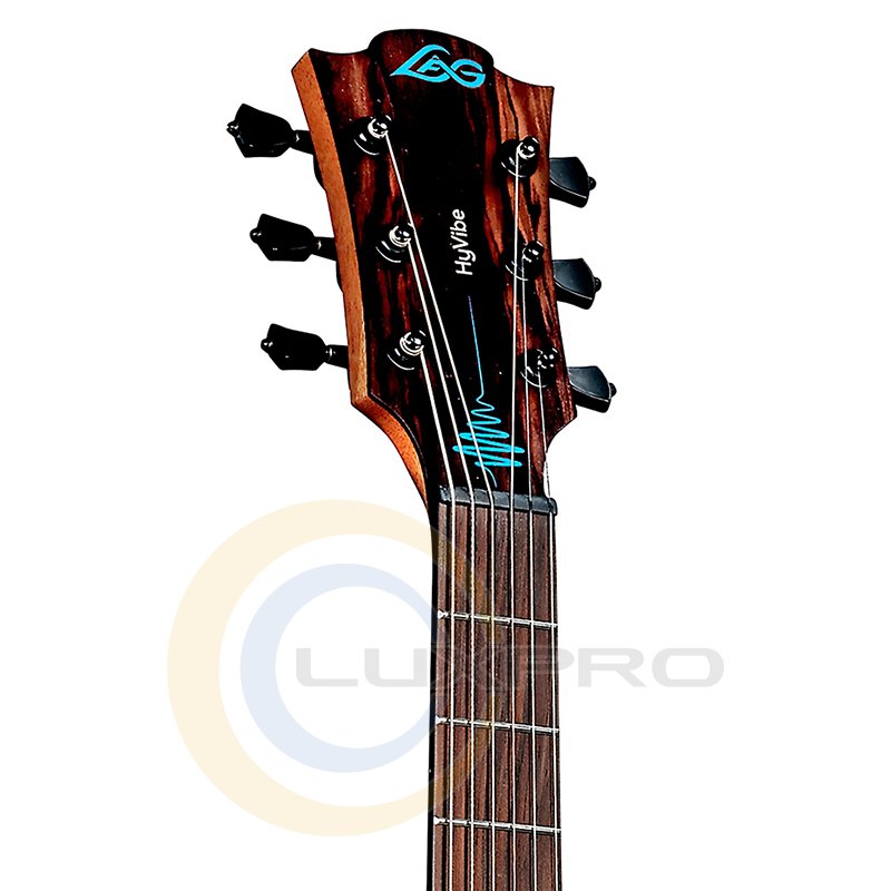 Если посмотреть на LAG Tramontane HyVibe 20, вы не заметите ничего особенно необычного. Обычный стиль Lag, как всегда, стильный,дизайн грифа и моста, черную фурнитуру и эллиптическую розетку. Его современный внешний вид еще более усиливается за счет удаления накладок и сатинировки с открытыми порами. Только синяя графика на головке и розетке намекает на любые необычные возможности, потому что это принципиально отличная акустическая гитара.