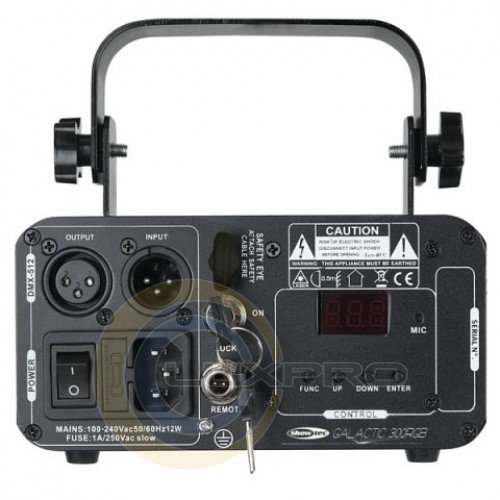 Лазер Galactic RGB 300 класса 3B с TTL модуляцией. Включает красный и синий лазерные диоды и зелёный DPSS. Управление устройством осуществляется, в том числе, с котроллера при помощи протокола DMX512, для чего предусмотрены разъёмы XLR 3-pin (вход и выход на иные устройства). В ручном режиме могут быть задействованы LED дисплей и кнопки меню или ИК пульт ДУ (входит в комплект). Для режима звуковой активации предусмотрен интегрированный в корпус микрофон.