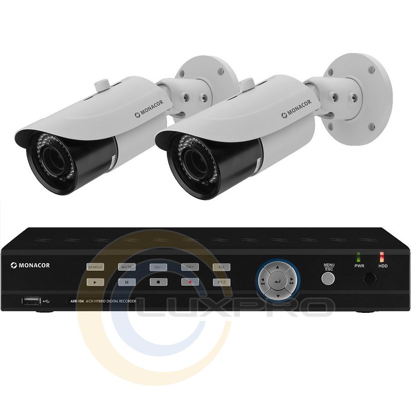 MONACOR AXZ-204BVM - камера, комплект видеонаблюдения HYBRID Line, состоящий из 4-канального цифрового видеорегистратора HYBRID Line AXR-104 и 2 цветных камер HYBRID Line AXC-2812BVM.