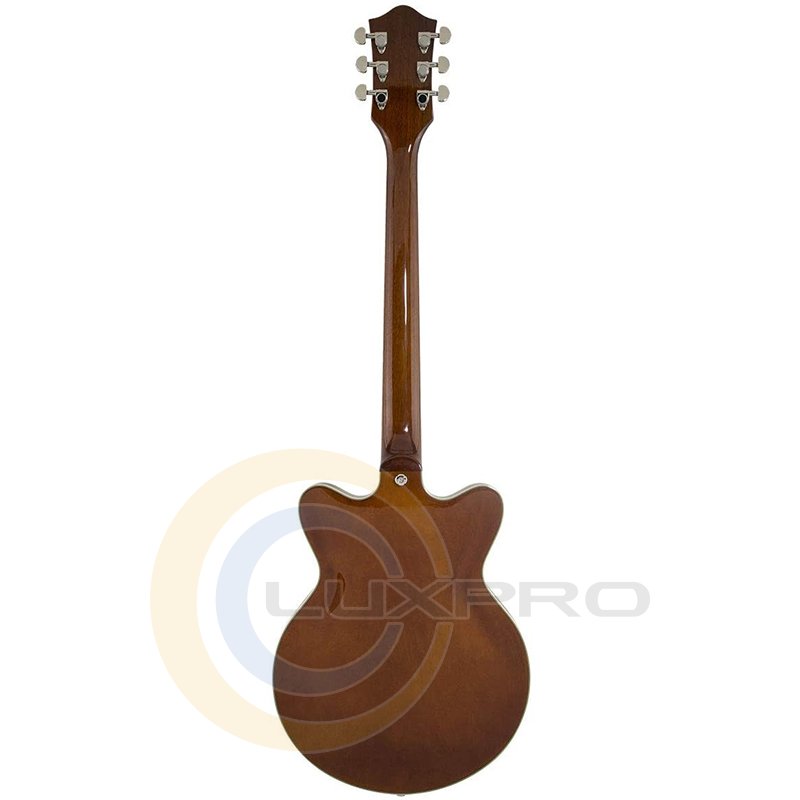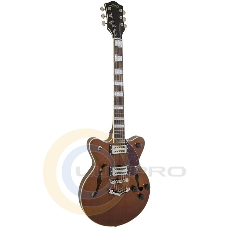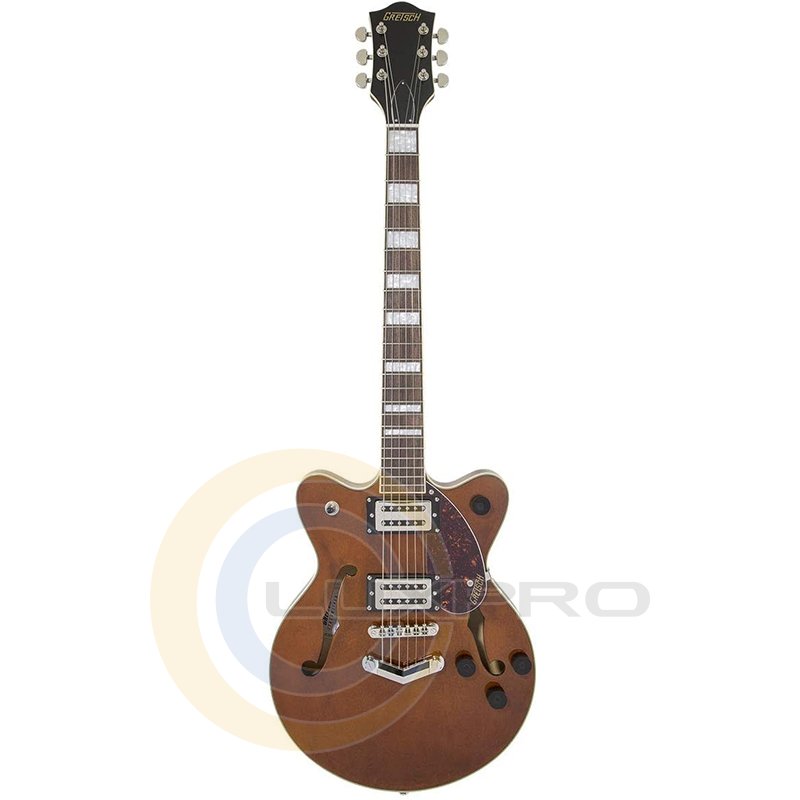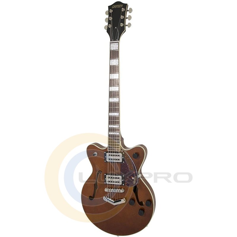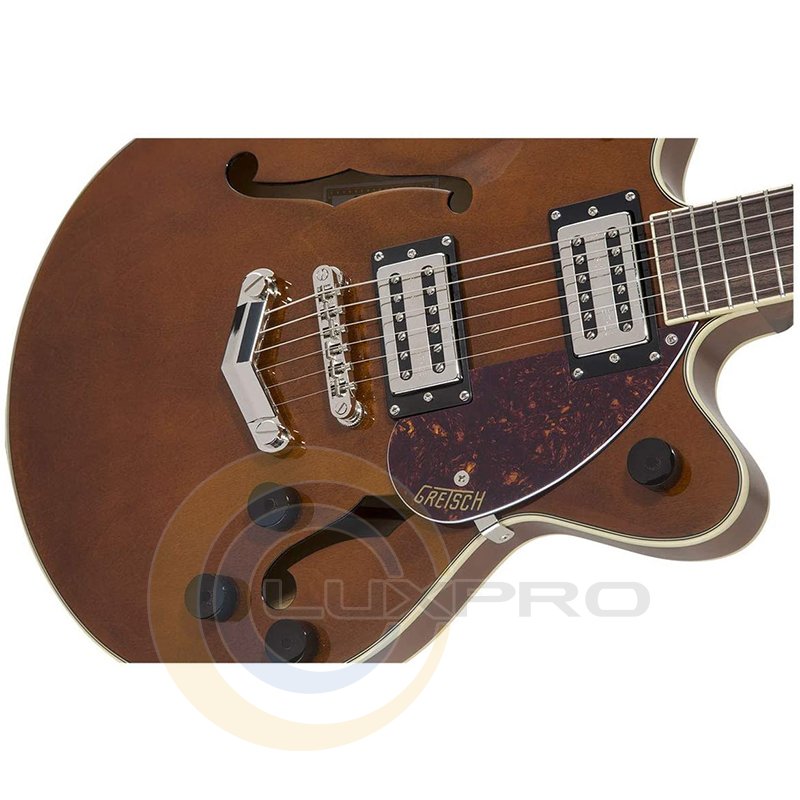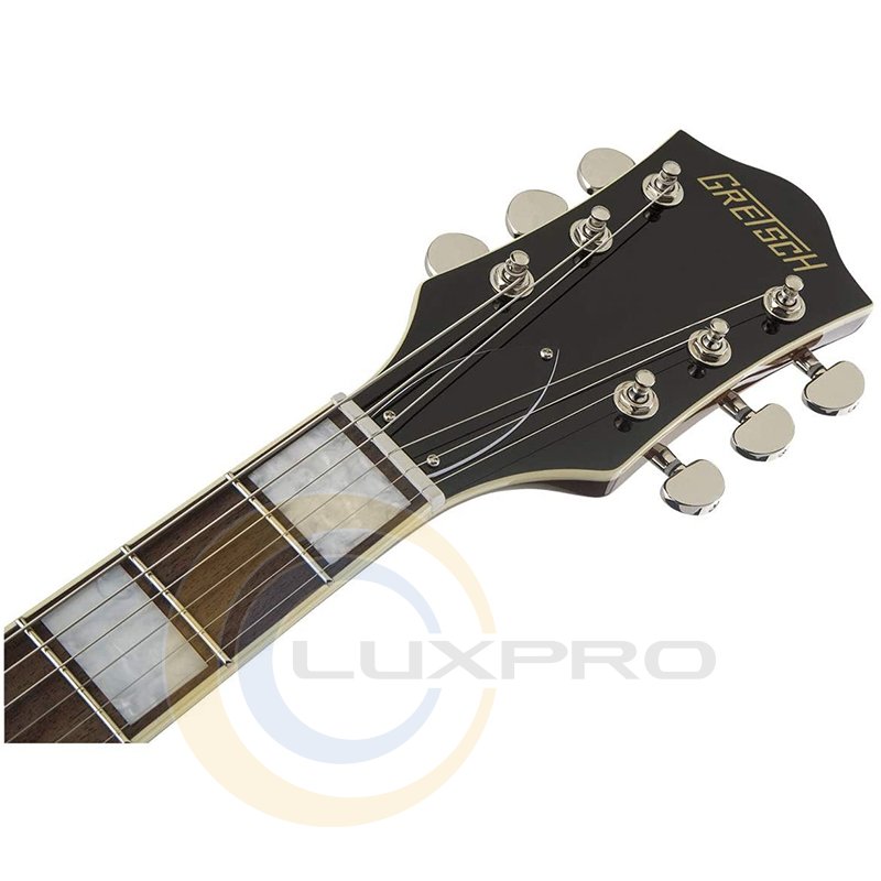 Broad'Tron - это звукосниматель с высоким уровнем выхода, выдающий уникальный звук благодаря сочетанию мощных густых низов, чистых и прозрачных верхних частот, хрипловатой середины. Переключатель – 3-позиционный. В дополнение к регуляторам тембра и общего уровня громкости предусмотрены отдельные регуляторы громкости для каждого из звукоснимателей. Дека гитары формы Streamliner Center Block с двумя вырезами выполнена из ламинированного клена. Гриф удобного для быстрой игры профиля Thin "U" – из древесины нато, с глянцевой отделкой и белой окантовкой. Мензура – 24.75" (629 мм). Накладка – лаурель, радиус – 12" (305 мм). На грифе 22 лада Medium Jumbo с инкрустацией перламутровыми прямоугольниками. Порожек выполнен из искусственной кости. Фиксированный бридж Adjusto-matic со стильным струнодержателем Gretsch "V" обеспечивают надежность строя.
