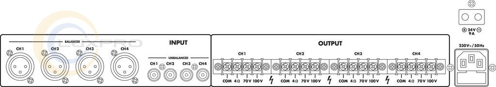 - номинальная мощность при 100 В: 4 х 50 Вт;