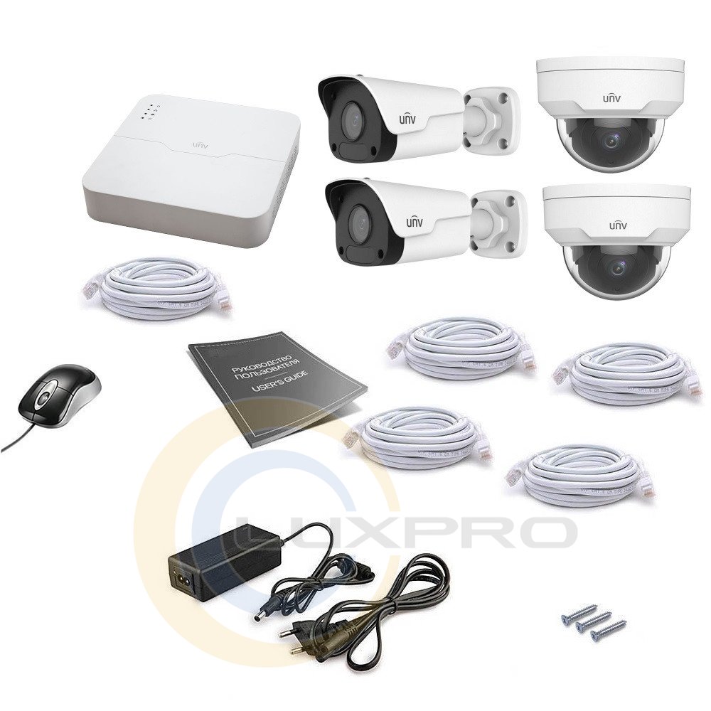 - комплект IP видеонаблюдения состоит из 4-х IP камеры разрешением 2Мп, сетевого видеорегистратора и монтажного комплекта, необходимого для самостоятельной установки;