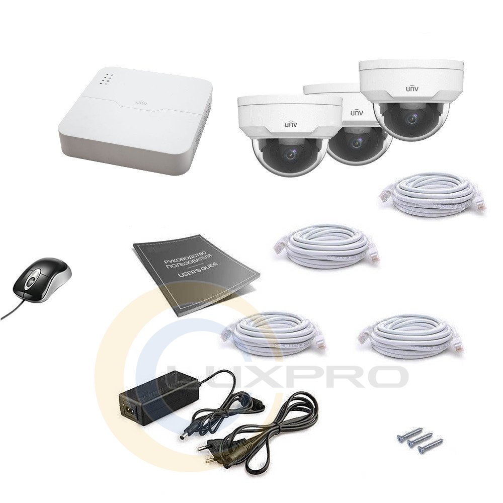- комплект IP видеонаблюдения состоит из 3-х IP камер разрешением 4Мп, сетевого видеорегистратора и монтажного комплекта, необходимого для самостоятельной установки;