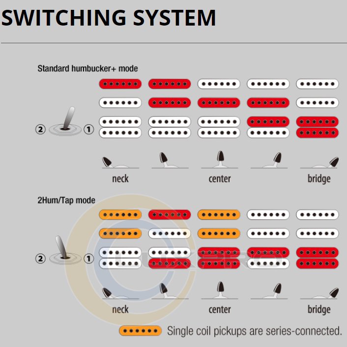 Система переключателей dyna-MIX 9 с переключателем Alter предлагает девять вариаций звука и может легко переключаться между режимами хамбакера и сингла с помощью мини-переключателя. Один режим даже способен имитировать звук хамбакера из конфигурации двух синглов.