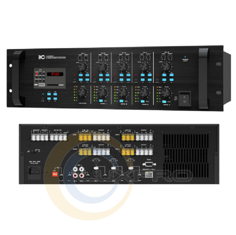 Все входные сигналы имеют отдельный регулятор тона, что значительно влияет на подбор соответствующего звука. Внутренним источником модуляции в усилителе ITC Audio T-4240MP является тюнер FM с 99 станциями или MP3-плеер с портом USB или SD-картой. Усилитель полностью защищён в случае короткого замыкания, перегрузки или перегрева, что обеспечивает долгую и стабильную работу устройства.Характеристики: