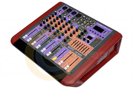 Возможность подключения до 4х микрофонов и наличие 2 х стереопар, кроме того каждый канал имеет 3х полосный эквалайзер для комфортной настройки звучания. К достоинствам пульта можно отнести наличие 32х bit цифрового процессора эффектов и наличие медиаплеера для проигрывания композиций через USB или SD карт слоты, Bluetooth. Имея вес 4.8 кг пульт имеет стереоусилитель 2 х 250 Вт.