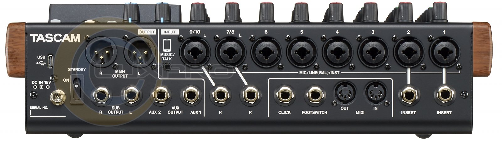 TASCAM Model 12 может записывать до 12 каналов аудио (10 входов и стереомикс) одновременно на карту памяти формата SD. Такая возможность пригодится для записи репетиций или небольших выступлений, а также в моменты, когда лень включать компьютер и запускать DAW. Аудио записывается в формате WAV с частотой дискретизации 44.1 или 48 кГц и разрядностью 16 или 24 бита. Дополнительно в микшере предусмотрена функция мультитрекового воспроизведения — можно загрузить на карту памяти бэк- и джем-трек или подложку.