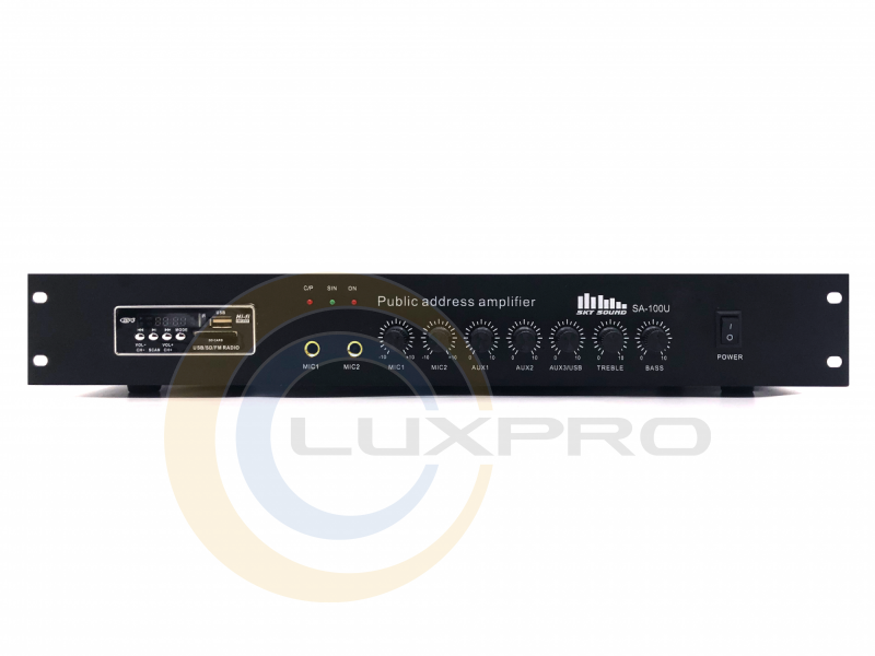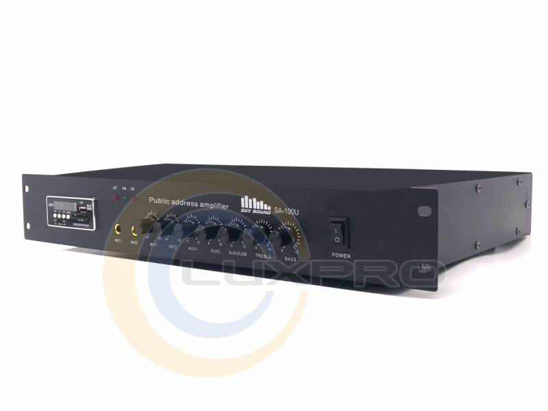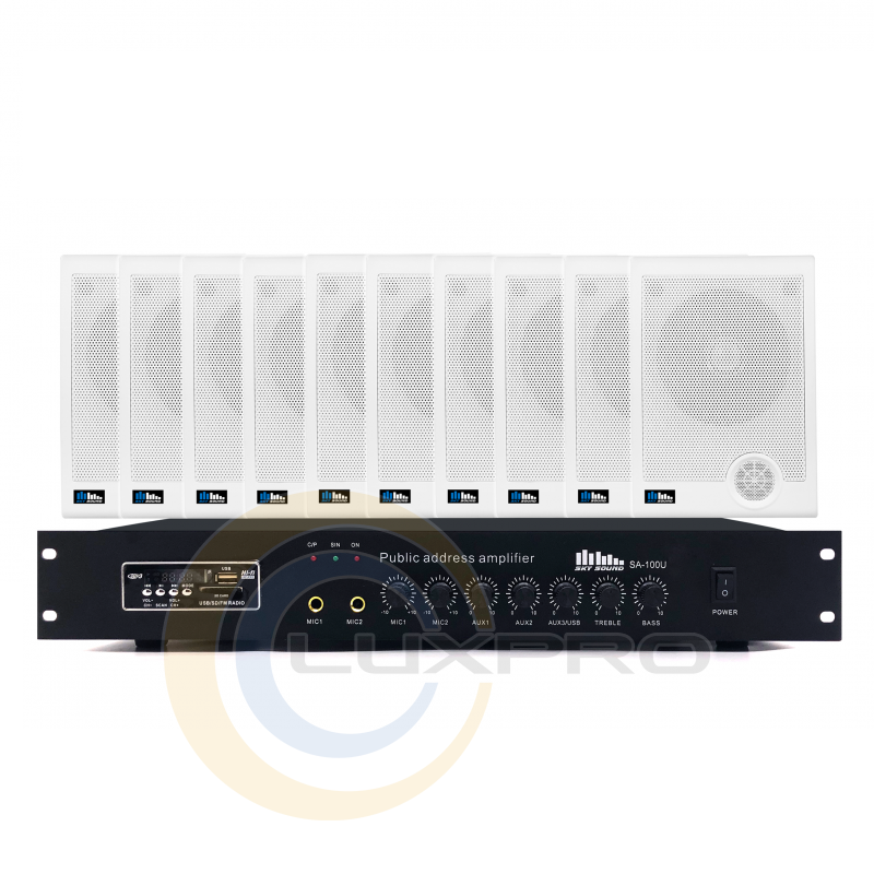 Акустический комплект Sky Sound WS-2010. Трансляционный усилитель SKY SOUND SA-100U мощностью 100 Вт, предназначен для создания небольших систем трансляции и озвучивания с суммарной мощностью подключаемой акустики не более 100-та Ватт. Модель популярна в системах оповещения как различных открытых небольших площадей так и торговых предприятий, офисных помещений, кафе и ресторанов. Помимо двух микрофонных и двух универсальных входов, усилитель SA-100U содержит встроенный проигрыватель FM-тюнер/USB/SD-карт/ Bluetooth , что особенно удобно для организации систем фонового озвучивания и рекламной трансляции для небольших магазинов, баров или кафе.