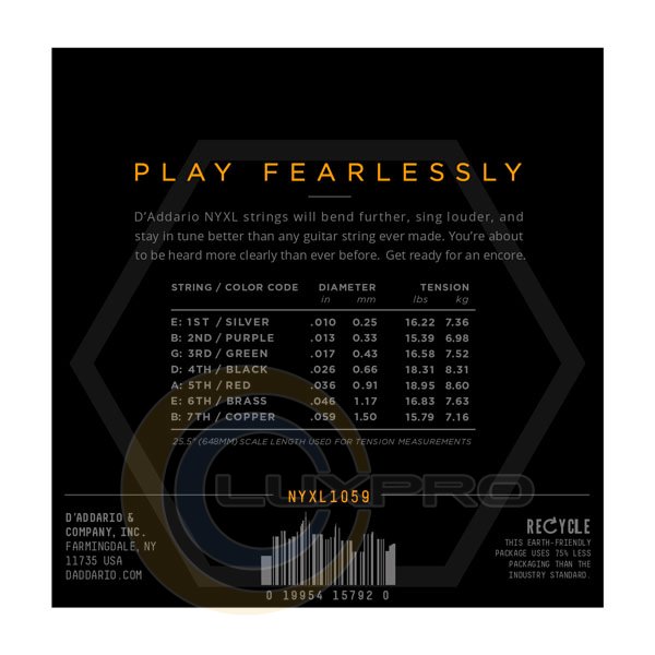 - NYXL1059 идеально подходят для 7-струнных инструментов с мензурой 25.5": .010, .013, .017, .026w, .036w, .046w, .059w;