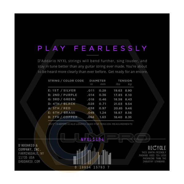 - NYXL1164 идеально подходят для 7-струнных инструментов с мензурой 25.5": .011, .014, .018, .028w, .038w, .049w, .064w;