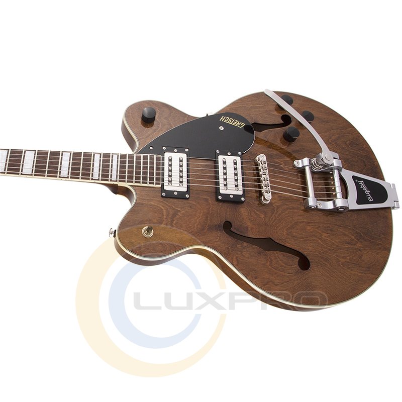 Электрогитара полуакустическая, дека - клен с центр-блоком из ели, гриф - нато/лаурель, звукосниматели - Broad’Tron™ BT-2S, тремоло Bigsby, цвет - коричневый.