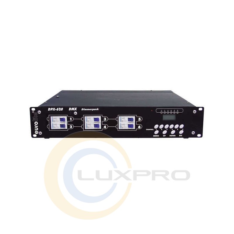 EUROLITE DPX-620 DMX - универсальный профессиональный диммер, возможность работы от однофазной и трехфазной сети 6 х 20 А, управление сигналом DMX или аналоговым сигналом, стартовый адрес DMX устанавливается непосредственно на приборе, возможна синхронизация работы нескольких DPX-620 через DMX-контроллер, установка времени нагрева лампы, светодиодный дисплей и индикаторы, отображающие все режимы, автоматический предохранитель на каждом канале, выходы выполнены на клеммных разъемах, расположенных за задней панелью.