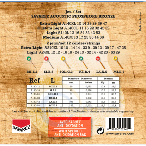 A140L — это струны для акустических гитар, с закаленным сердечником из высокоуглеродистой стали и обмоткой из фосфорной бронзы. Струны отличаются чистыми, четкими и теплыми тонами. Очень специфичное качество звука, проекция и громкость звука, динамика и баланс игры были определены известными и хорошо знаю гитаристами. Они играли строки бескомпромиссно в течение нескольких месяцев. Их советы и обратные связи были решающими.