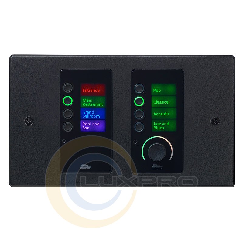 Кольцо кодировщика может отображать прыгающий аудиометр. Когда нажимной / поворотный энкодер вращается, кольцо энкодера может временно отображать настройку громкости. При нажатии на нажимной / поворотный энкодер кольцо энкодера может временно отображать установку двоичного параметра (например, красный / зеленый для состояния без звука / включения звука). Восемь кнопок могут быть нажаты для управления двоичными параметрами (например, отключение звука), вызов предустановки или выбор источника. Каждый из двух ЖК-экранов имеет разрешение 64×128 пикселей и может отображать собственный текст.