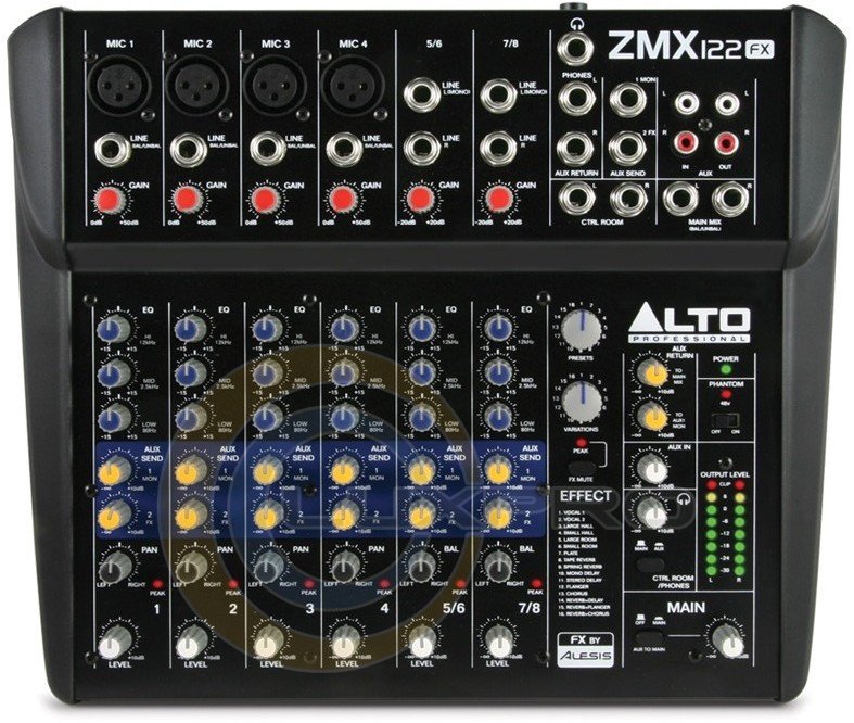 Микшерный пульт ZMX122FX с 4 мик/инстр. аналоговыми входами + 2 стереопары, установлен 3-полосный эквалайзер на каждом канале