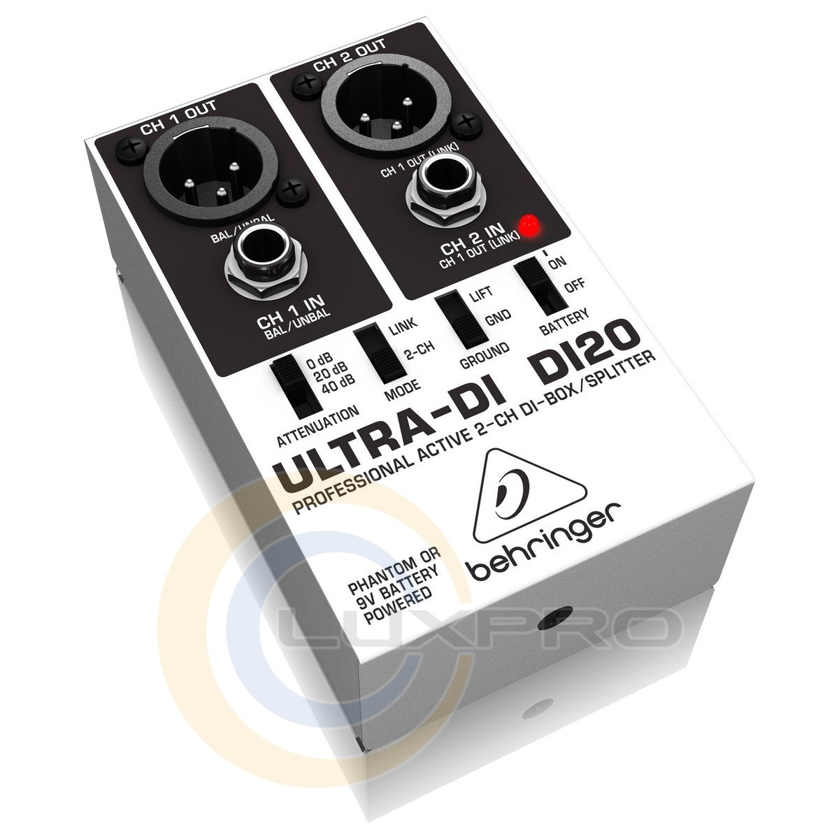 ULTRA-DI DI20 – инновационный активный 2-канальный DI-бокс/сплиттер, с помощью которого можно снимать сигнал непосредственно с несимметричного высокоомного выхода - скажем, электрогитары или баса - и направлять его прямо на микшерский пульт или рекордер. Его место в «гиг бэге» любого музыканта (особенно гитариста или басиста), а также среди стандартного набора оборудования звукоинженеров студий, радио, концертных или зрелищных мероприятий, или инсталляционных техников.DI20 конвертирует 2 отдельных несимметричных сигнала, поступающих на 1/4"-входы в 2 симметричных сигнала на выходах XLR. Режимы работы 2-channel и Link обеспечивают гибкое использование как моно или 2-канальный DI-бокс, или сплиттер. В режиме Link сигнал канала 1 подается одновременно на оба симметричных выхода XLR и несимметричный 1/4" разъем второго канала. Благодаря 3-позиционному аттенюатору, допустимый уровень входного сигнала может достигать +48 дБu, в то время как переключатель Ground Lift устраняет типичные проблемы заземления. Питание осуществляется от батарейки (9 В) или фантомного питания (48 В). Устройство выполнено из надежных компонентов в компактном, исключительно прочном корпусе.Особенности: