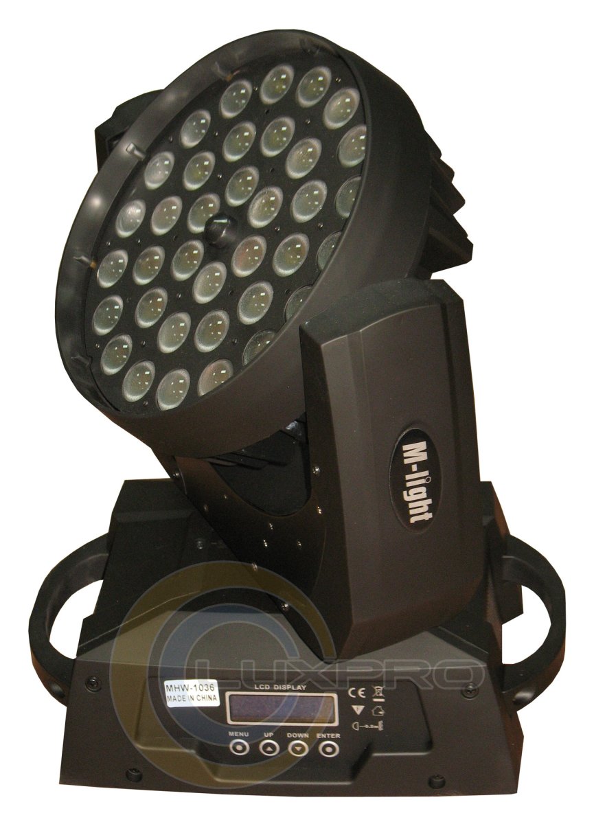 Мощная и быстрая заливочная светодиодная голова M-LIGHT MHW-1036, оснащенная 36 шт светодиодов каждый мощностью 10W, RGBW с функцией ZOOM. Прибор обладает всеми необходимыми функциями для применения в: клубах, ресторанах, на сценах. Голова имеет 13 каналов управления по протоколу DMX 512. Этот световой прибор удовлетворит все Ваши потребности в красочном и стильном освещении любого мероприятия.Характеристики: