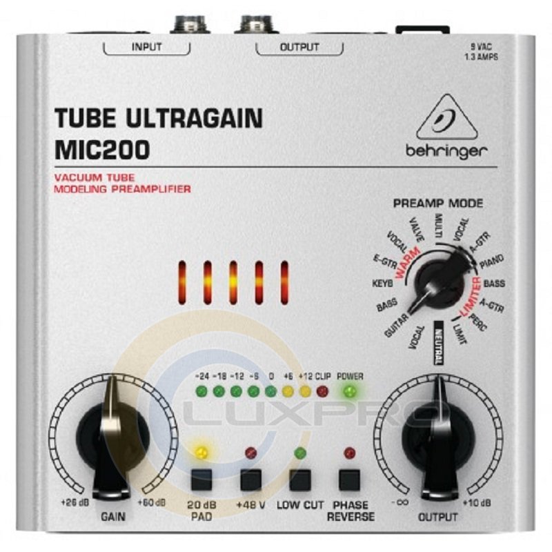 TUBE ULTRAGAIN MIC200 вдохнет жизнь в стерильный звук цифровых рекордеров и звуковых карт. Он также является идеальным дополнение к любому конденсаторному микрофону и может быть использован как высококлассный DI-бокс, обеспечивающий исключительную прозрачность сигнала. MIC200 имеет переключатель фазы, фантомное питание +48 В, и аттенюатор 20 дБ. Симметричные входы и выходы выполнены на ¼" TRS- и позолоченных XLR-разъемах.