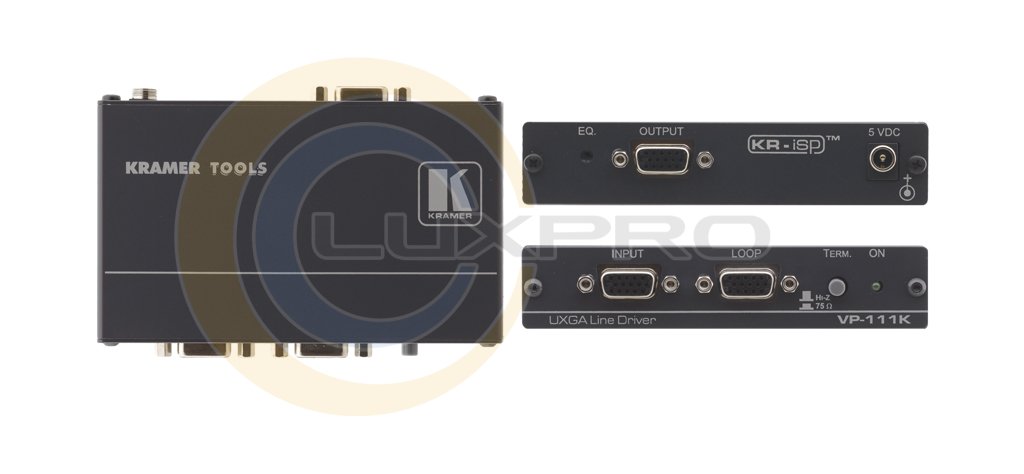 Kramer VP-111K— высококачественный линейный усилитель для компьютерного графического сигнала с разрешением превышающим UXGA. Прибор обеспечивает регулируемую компенсацию потерь сигнала в длинных кабелях.