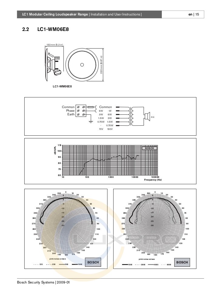 Гармонійне поєднання з іншими гучномовцями серії LC1 завдяки однаковим грат і одному набору аксесуарів. Режим повної, 1/2, 1/4 і 1/8 потужності (перемикання потужності на трансформатора 70/100 В). Відповідає європейському стандарту для систем аварійного озвучування/сповіщення EN 60849: керамічний коннектор (кріплення під гвинт), термопредохранитель, проводка, стійка до впливу високих температур. При підвищенні температури, термозапобіжник відключає гучномовець від лінії, зберігаючи цілісність системи і працездатність інших гучномовців. Світлодіод, вбудований в корпус, забезпечує контроль цілісності лінії, підключеної до даного гучномовця (при установці плати контролю LC1-PIB, поставляється опціонально). Для захисту від пожежі може бути додатково оснащений металевим протипожежним куполом LC1-MFD.