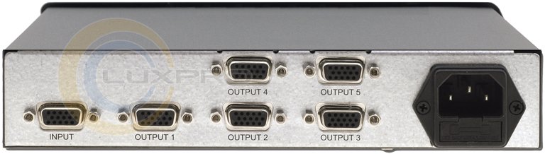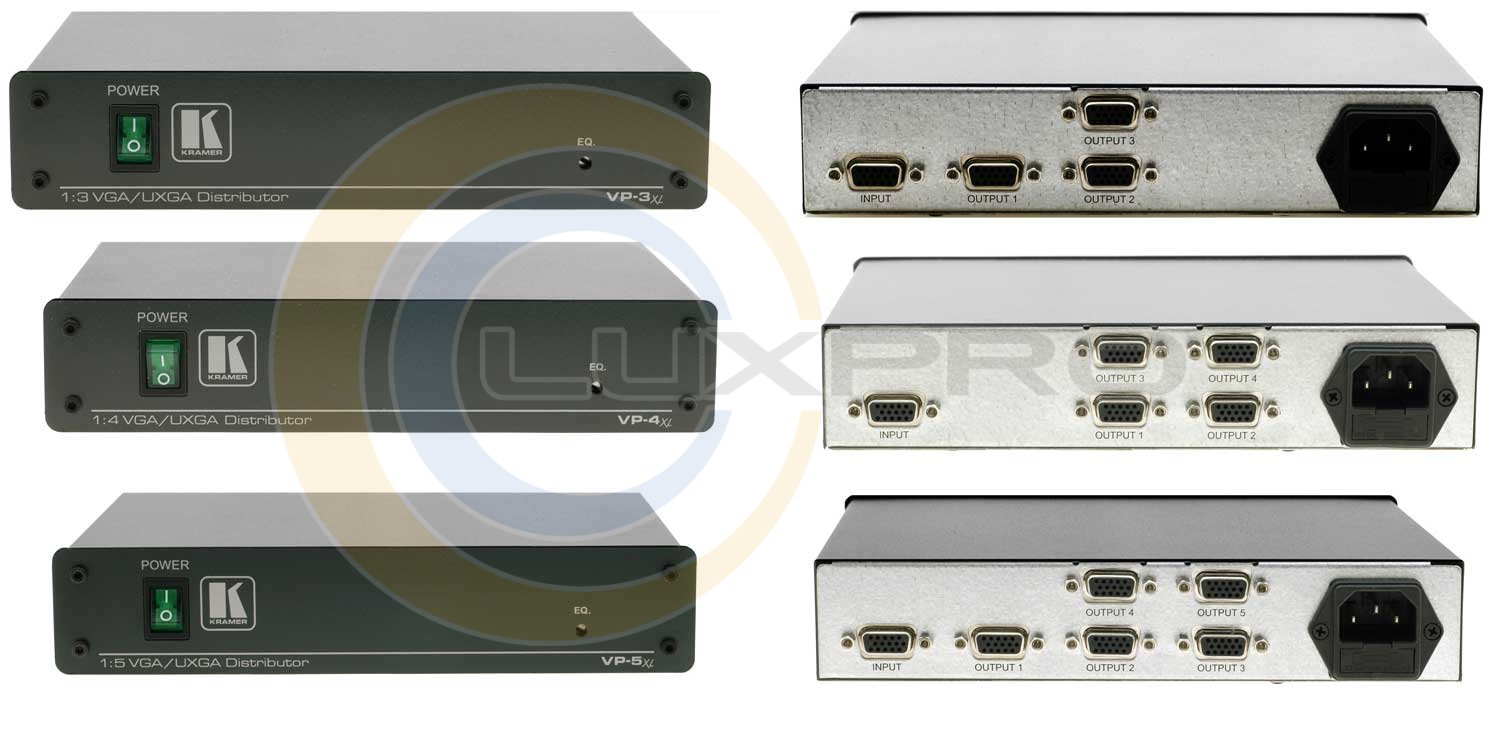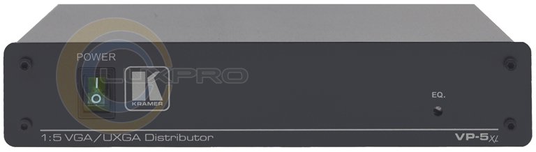 VP-5xl - високоякісний підсилювач-розподільник 1: 5 для сигналів VGA. Прилад має на передній панелі регулятор компенсації АЧХ і перемикач управління ідентифікаційним бітом. Ширина смуги пропускання перевищує 375МГц, що робить підсилювач придатним для розподілу графічних сигналів найвищого дозволу. Прилад має один вхід і, забезпечуючи необхідну буферизацию і ізоляцію, розподіляє його сигнал на ідентичні виходи. Підсилювач живиться від мережі змінного струму і виконаний в корпусі шириною в половину стандартного 19-дюймового конструктиву.Характеристики: