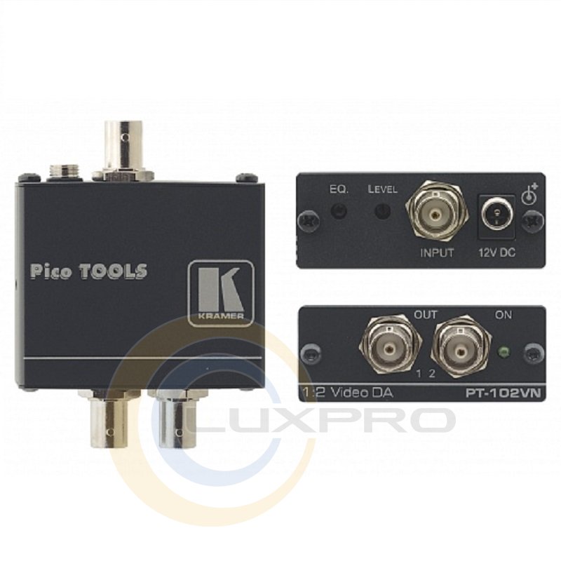 PT-102VN - підсилювач-розподільник 1: 2 композитних відеосигналів, що розподіляє вхідний сигнал на два ідентичних виходу (роз'єми BNC). Завдяки смузі пропускання 430 МГц пристрій є повністю прозорим елементом. Може використовуватися з підсилювачем-розподільником звукових сигналів PT-102А. У комплект входить джерело живлення 12 В.
