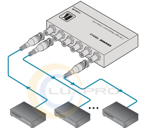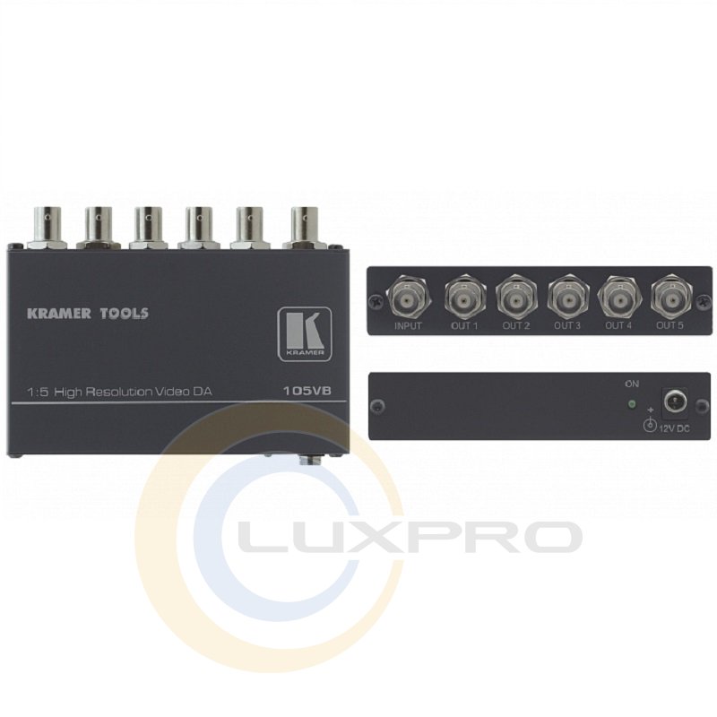105VB - підсилювач-розподільник 1: 5 композитних відеосигналів, роз'єми BNC. Завдяки смузі пропускання 280 МГц пристрій є повністю прозорим для відео. Поставляється в комплекті з джерелом живлення 12 В. Відноситься до сімейства TOOLS - групі високоякісних і компактних приладів.