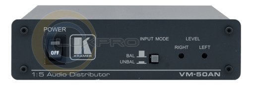 VM-50AN - унікальний високоякісний підсилювач-розподільник 1: 5 або 1:10 звукових сигналів, що працює як з балансними, так і з небалансних стереофонічними звуковими сигналами. Підсилювач отримує на вході балансний або небалансний звук, тип вибирається користувачем з передньої панелі (одночасно обидва вхідних формату не підтримуються, так як при цьому використовуються деякі загальні ланцюга). На виході завжди є 10 стереофонических каналів, з яких 5 - небалансних, 5 - балансних. Всі ці канали можна використовувати одночасно. Для небалансних входів / виходів використовуються 3,5 мм міні-гнізда, для балансних - знімні клемні модульні роз'єми. VM-50AN може працювати автономно або в поєднанні з іншими виробами Kramer серії "50", такими як VM-50V або VM-50YC. Пристрій живиться від блоку живлення на 12 В, всередині відбувається перетворення цієї напруги до ± 15 В, що дозволяє передавати звукові сигнали з мовними рівнями. Для харчування до 6 пристроїв Kramer з харчуванням 12 В можна використовувати додаткове джерело VA-50P. Пристрій VM-50AN зібрано в жорсткому надійному корпусі настільного виконання і може монтуватися в стандартну 19 "стійку за допомогою адаптера RK-50RN, займаючи в ній два місця по вертикалі.Характеристики: