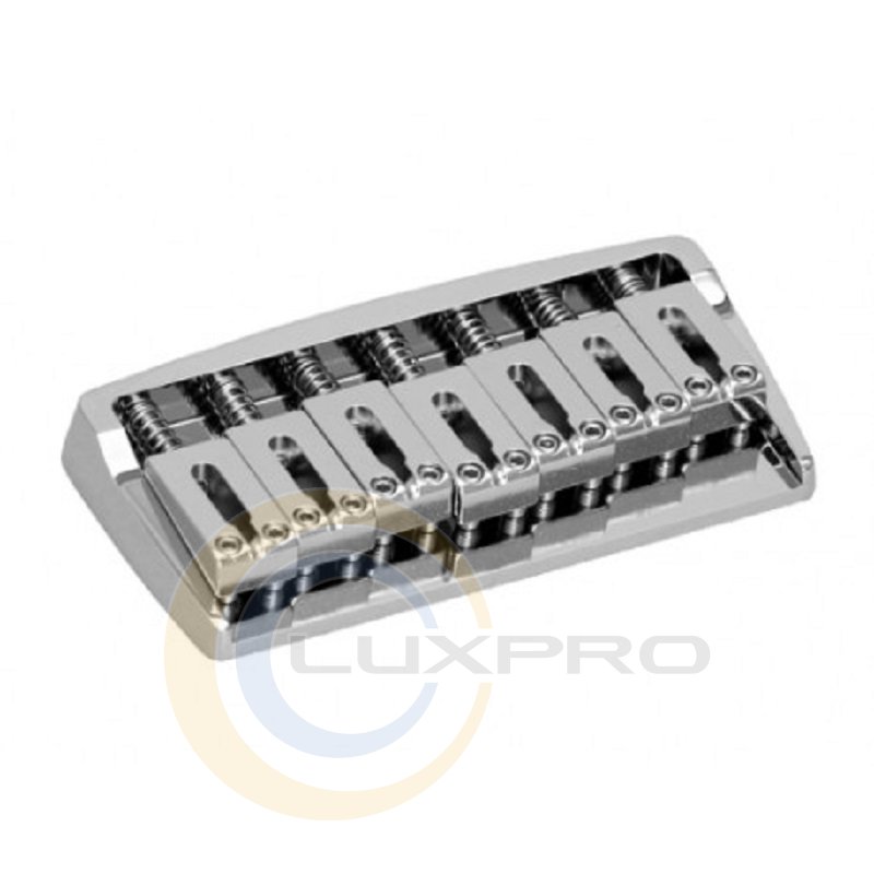 510FX-7 (C) - бридж для електрогітари, підходить для 7-струнних електрогітар, латунна пластина, сталеві сідла, межструнное 10.5 мм, колір: хром, виробництво: Японія. Цей новий фіксований бридж поєднує в собі опорну пластину, вирізану з цілісного латунного блоку на верстаті з ЧПУ, зі сталевими сідлами. Він розкішно виглядає і забезпечує багатий тон.