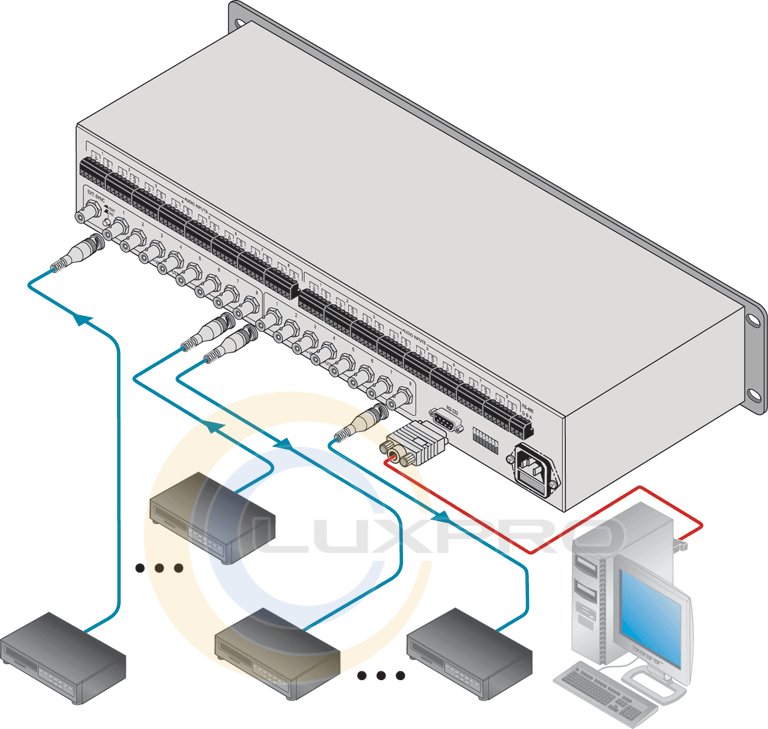 В пам'яті можна зберегти шість попередніх для отримання швидкого доступу до часто використовуваних конфігурацій. Функція TAKE дозволяє розмістити кілька комутацій в черзі, а потім активувати їх одним натисненням кнопки. У комплект входить програмне забезпечення для Windows®. Управління здійснюється кнопками на лицьовій панелі, по інтерфейсах RS-232 і RS-485. Комутатор простий у використанні, виконаний в надійному і міцному корпусі і розміщується в стандартній 19 "стійці, займаючи висоту 2U. Завдяки смузі пропускання 200 МГц пристрій є повністю прозорим елементом на шляху проходження сигналу.