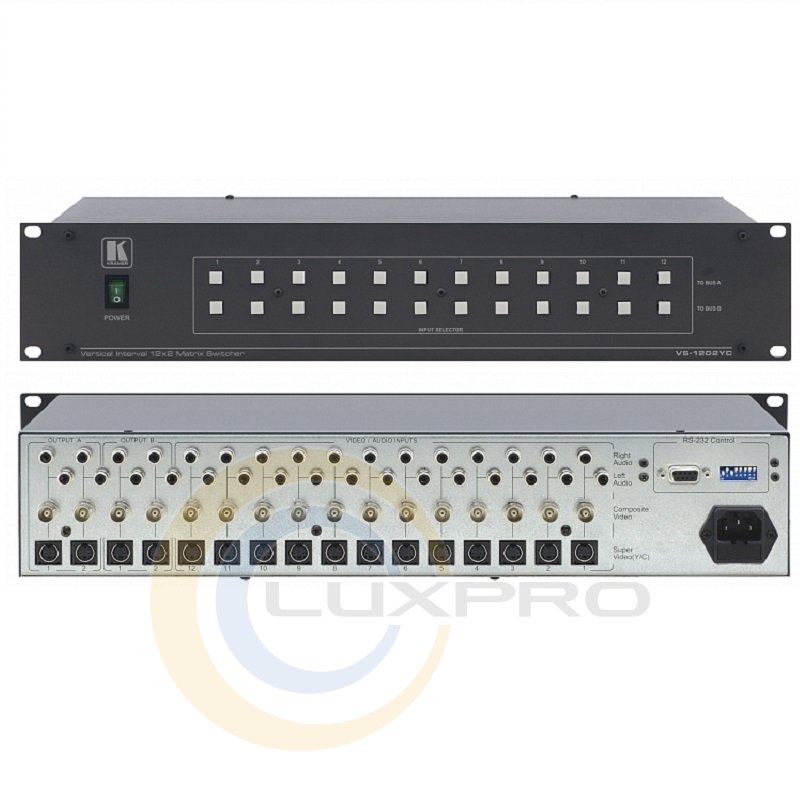 VS-1202YC - матричний комутатор 12: 2 сигналів S-video, композитного відео і стерео аудіо сигналів з перемиканням в інтервалі вертикального кадрового імпульсу, що гасить. Два з дванадцяти вхідних сигналів можуть бути скоммутіровани одночасно на обидва виходи. Так як комутація відбувається в інтервалі кадрового імпульсу, що гасить, то при використанні синхронізованих джерел перехід здійснюється без підривів. На передній панелі розташовані два незалежних набору кнопок для вибору входів (по одному набору на кожен вихід), що зручно для застосування в системах, де необхідно попередньо переглянути сигнал на вході перед комутацією його на головний вихід.