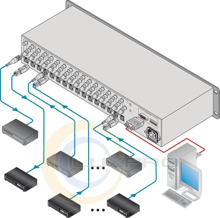 - входи - 12 відео композитних, 1 В / 75 Ом, роз'єми BNC; 12 S-video, 1 В / 75 Ом (Y), 0,3 В / 75 Ом (C), роз'єми 4-pin; 12 аудіо стерео, 10 кОм, роз'єми RCA;