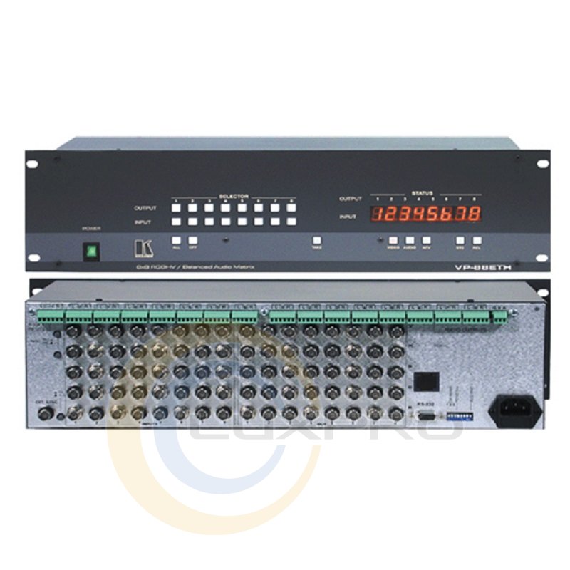 - виходи - групи виходів містять: канали RGB (0,7 В, 75 Ом, роз'єми BNC); канали малої й кадрової синхронізації, (ТТЛ, імпеданс 510 Ом), або рівень відео (0,7 В, 75 Ом), роз'єми BNC; канали балансного стерео аудіо, (+4 дБм, 33 ком, знімні клемні блоки); VP-66ETH: 6 груп виходів;