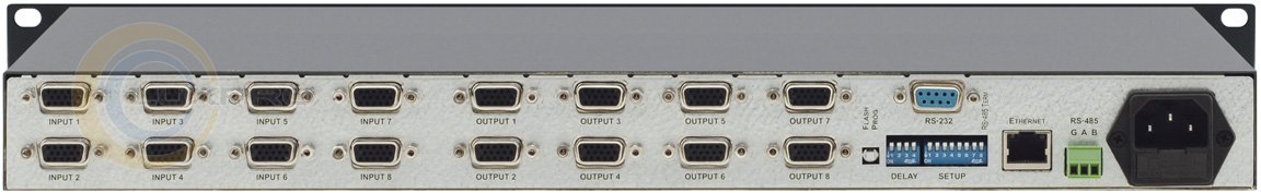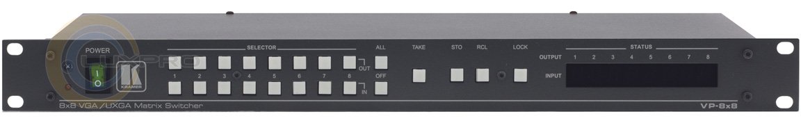 VP-8x8 - високоякісний матричний комутатор 8: 8 сигналів VGA. Це справжній матричний комутатор, що дозволяє перенаправити сигнал з одного, декількох або всіх входів на один, кілька або всі виходи одночасно. Комутація в VP-8x8 здійснюється без підривів зображення в інтервалі кадрового імпульсу, що гасить і може супроводжуватися затримкою появи зображення до 4 секунд (час задається оператором) при активному сигналі синхронізації.