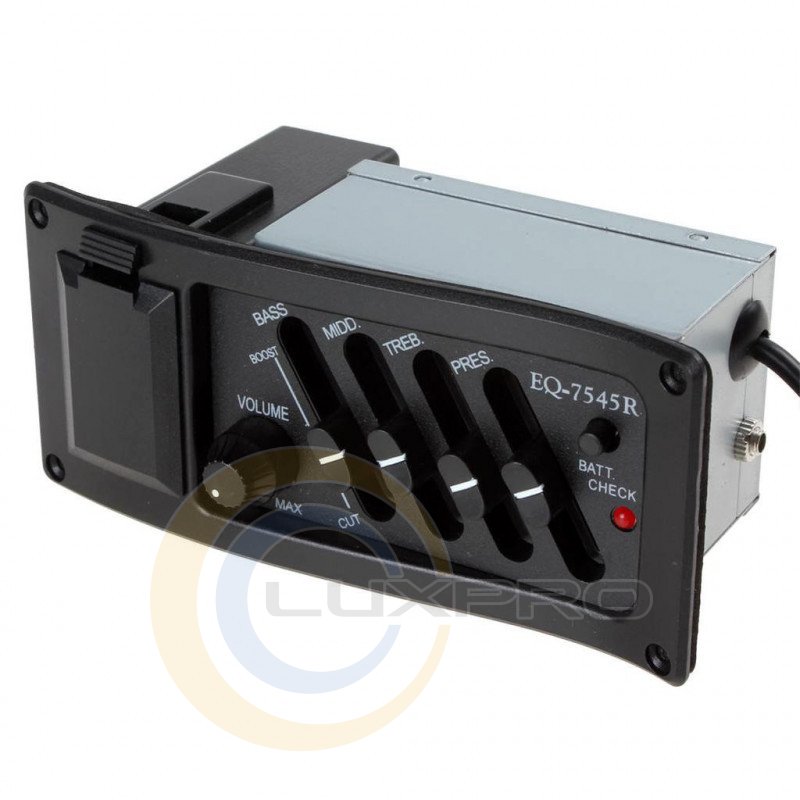 PAXPHIL EQ-7545R 4-BAND EQ ACOUSTIC PREAMP - активний передпідсилювач для акустичної / класичної гітари, для установки в корпус акустичної гітари, регулювання гучності, 4-смуговий еквалайзер, індикація заряду батареї, живлення від батареї 9В, темброблок, п'єзодатчик, проводка, гвинти для кріплення в комплекті, виробництво: Корея, гарантія: 12 місяців.